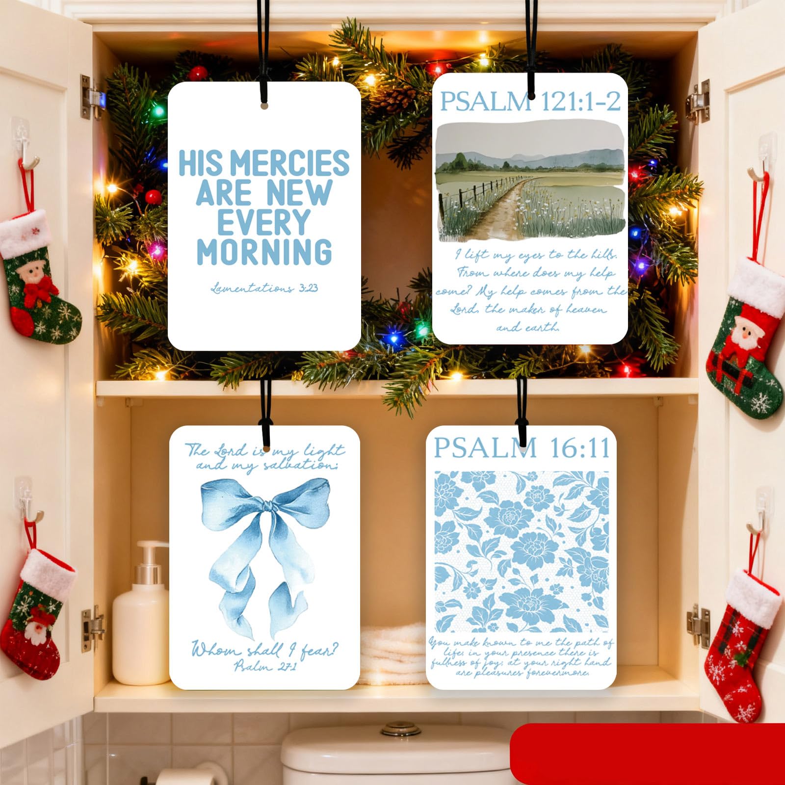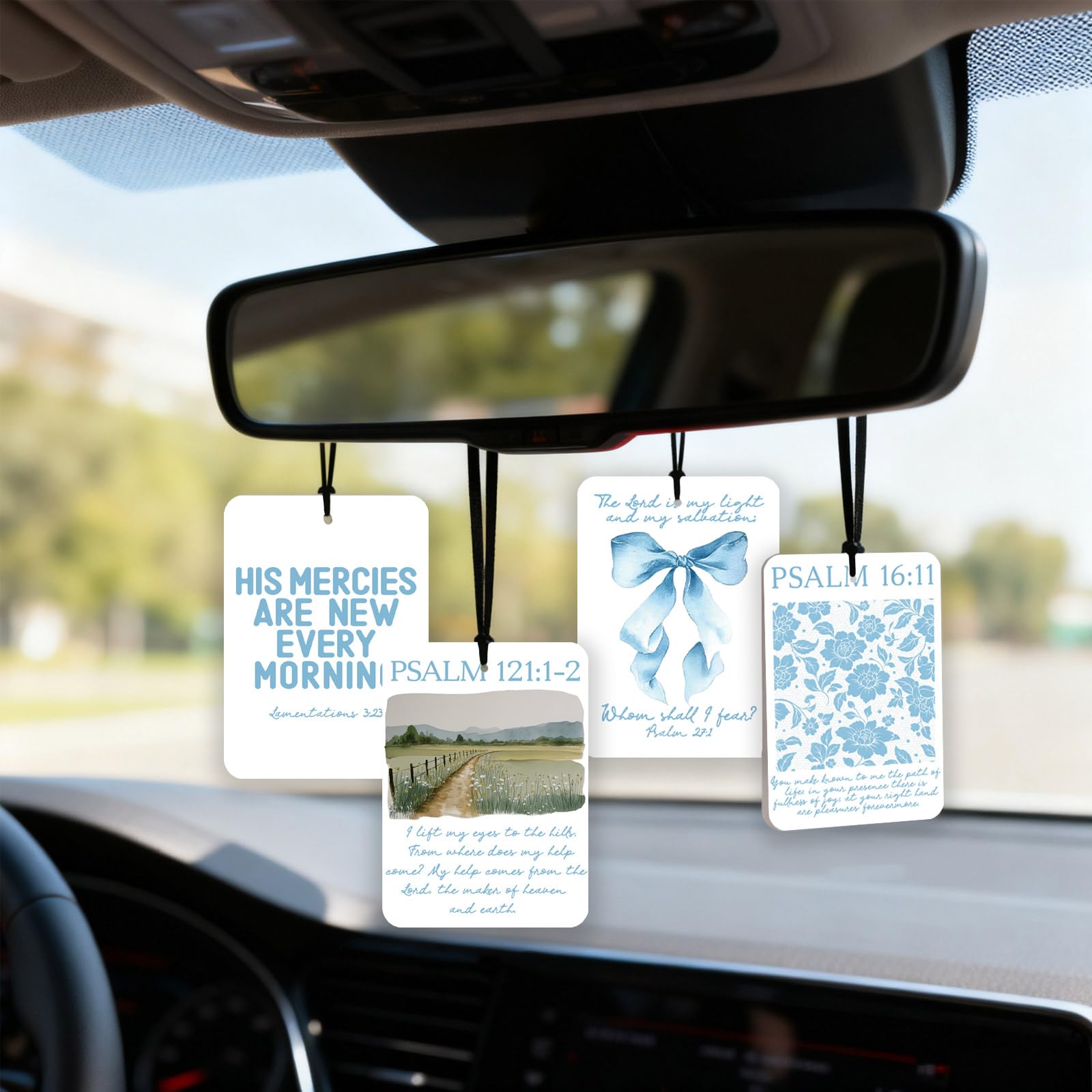 Bring faith and calm to your everyday journey with this Christian Bible Verse Air Freshener Set. Designed in soothing blue hues with comforting scriptures, each piece fills your space with a gentle scent and spiritual encouragement. Compact, beautiful, and meaningful, it’s a perfect way to keep God’s word close — or to share as an uplifting gift of faith and love.