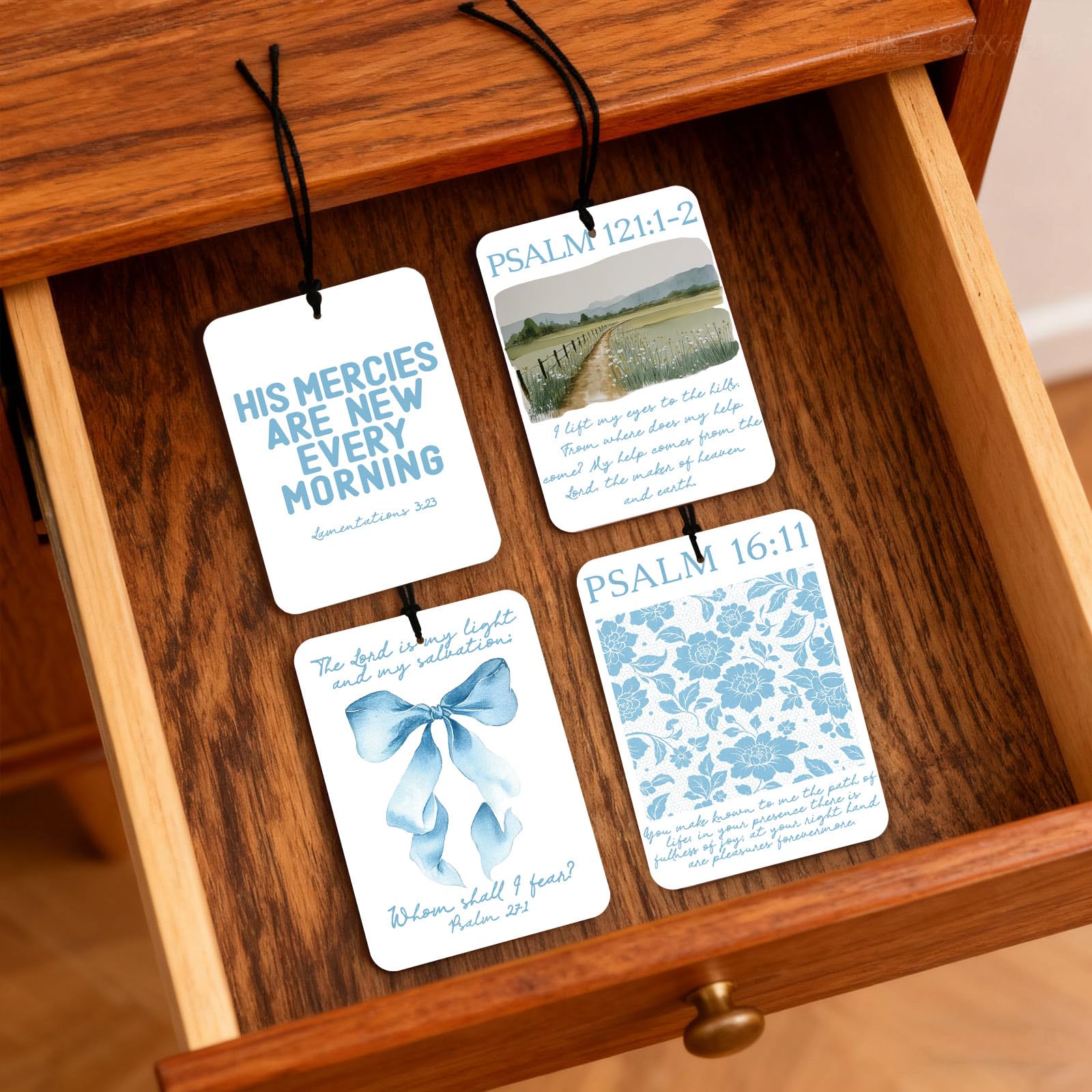 - Faith-Inspired Design: This 4-piece set features uplifting Bible verses from Psalms and Lamentations in elegant blue tones, paired with calming watercolor art and soft illustrations for a peaceful spiritual touch.